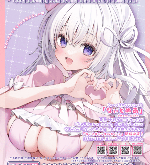 店内特設フェアブースにて開催Vtuber なぃとめあ「なぃとキャッスルかふぇ」開催期間2026/3/28(土)-5/4(月)※注意:3月29日(日)は貸切営業がございますので【15:00】OPENとなります。入場無料OP