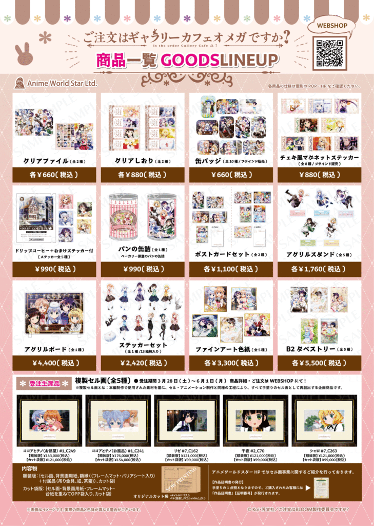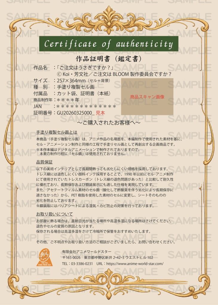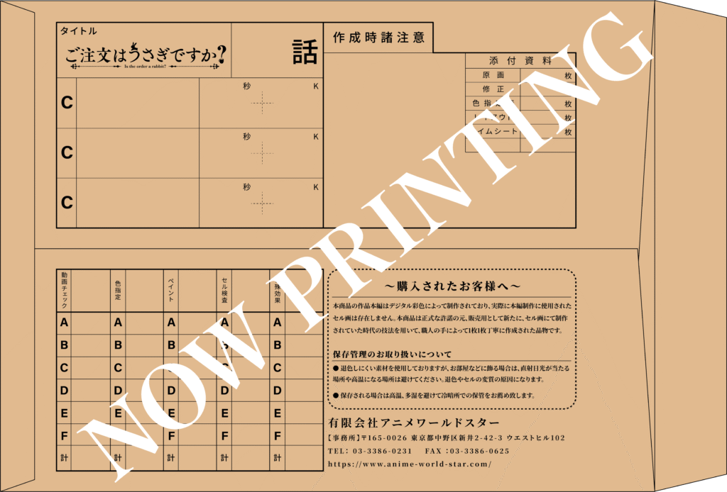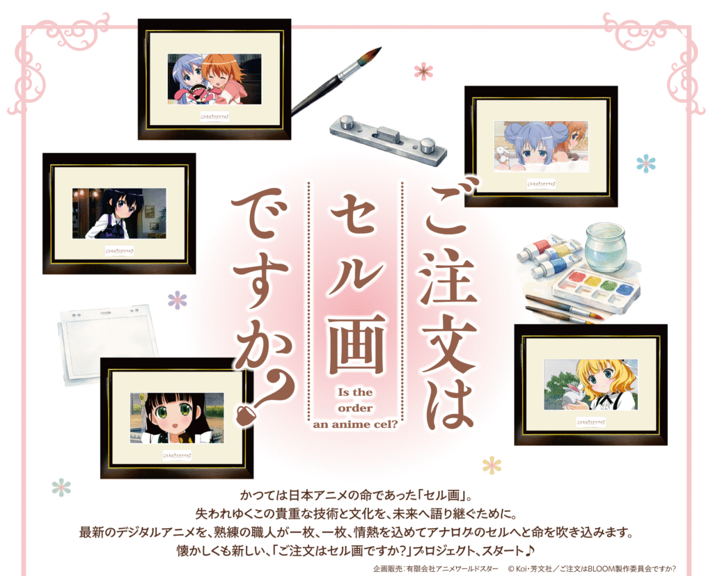 企画・販売を行わせていただいております有限会社アニメワールドスターではセル画事業として、長年セル画制作や研究を行われている制作スタジオ様との協力を行い、現在消滅しつつあるアニメーションのセル画技術の保存と継承の活動を行っております。今回、活動の一環として、手塗りのセル画を商品としてお客様にお届けし、新たにセル画の魅力を広め、制作を継続する為の循環モデルを構築することを目的に、アニメ「ご注文はうさぎですか?」を題材としたセル画制作プロジェクトが始動いたしました。